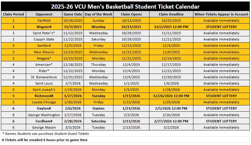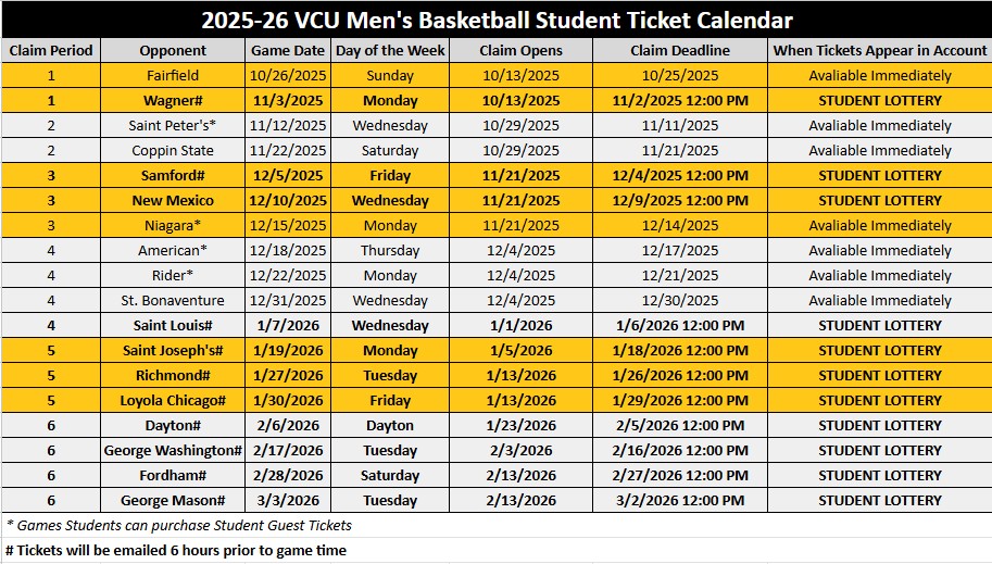 - Students will be able to purchase additional tickets for one additional guest for select games. Student guest tickets, when they are available to purchase, can be found under ‘Student Tickets’ on the VCU Athletics ticket website. The games that student student guest tickets are available are indicated on the claim calendar above.