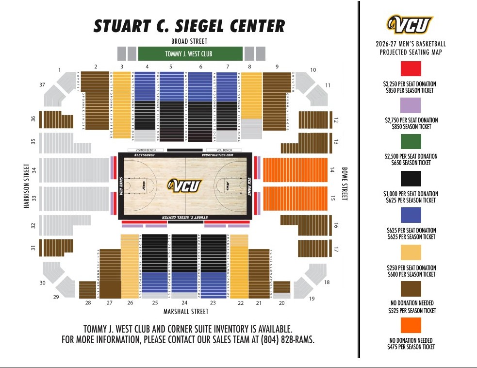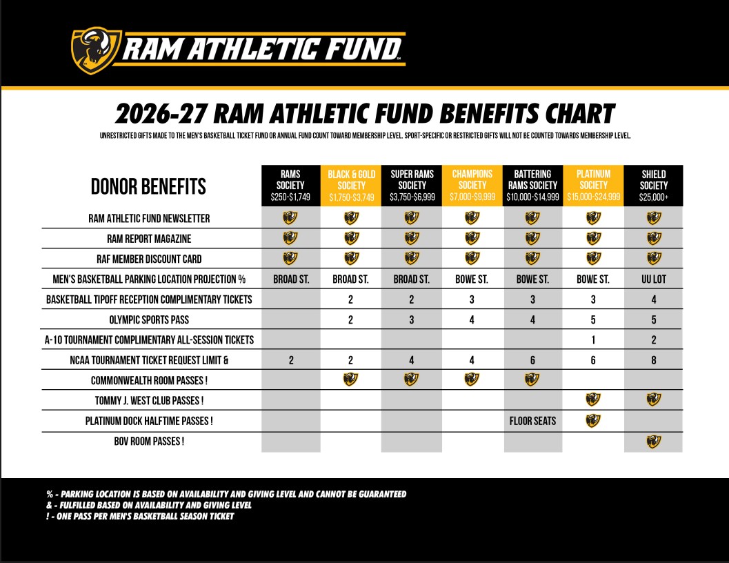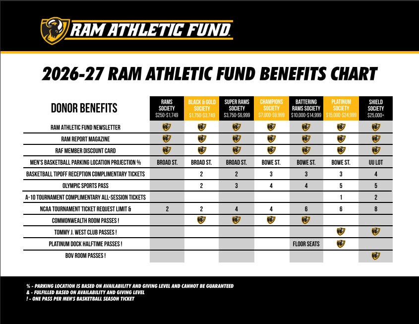 Donations made to fulfill required per seat contributions will be counted towards your giving level on the Ram Athletic Fund benefits chart. Any additional donations made to Ram Athletic Fund Annual Fund will also be counted towards benefits. For example, if you have two season tickets in the $250 per seat contribution area ($500 total donation), but you would like to receive access to the Commonwealth Room, you would need to donate an additional $1,250 to the Ram Athletic Fund in order to reach the Black & Gold Society and receive that benefit.